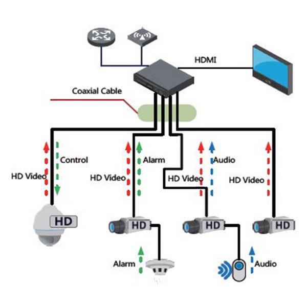 HD-over-Coax, or HD-CVI (High Definition Composite Video Interface), is an over-coaxial-cable analog HD video transmission standard developed specifically for the CCTV industry. HD-over-Coax composites video, audio, and control signals together and then transmits them over one coaxial cable, simplifying installation. Using RG-59 cable, HD-over-Coax transmits HD video over distances in excess of 500m (1640 ft.) with no expensive repeaters or signal boosters (more details below).