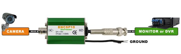 If your camera takes a direct hit from surge or lightning there is no way to protect the camera 100% but you can protect the DVR BNC inputs by using a device like our BNCSP10K to the right.