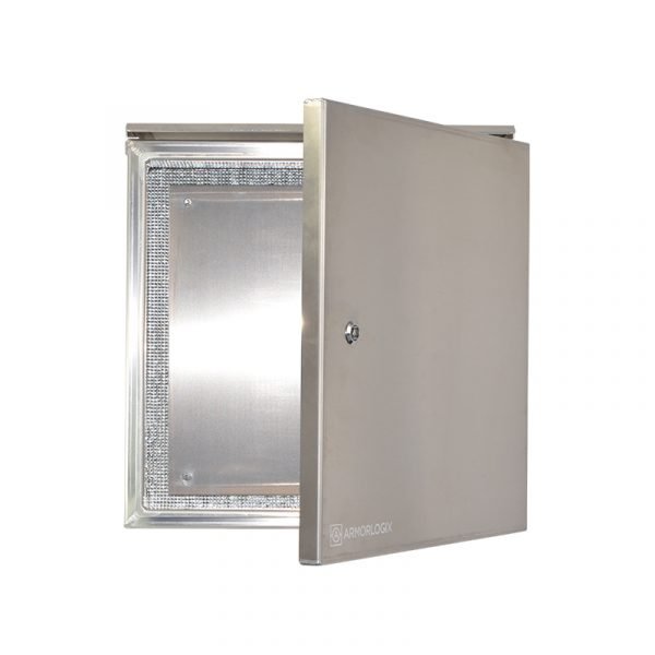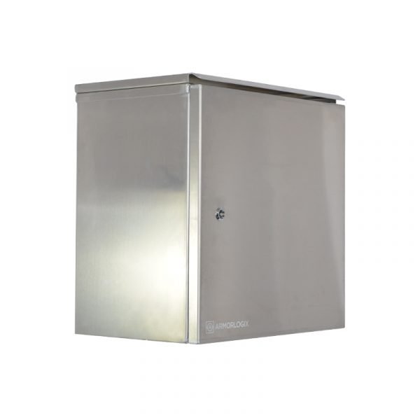 The NEMA4 19x19x12″ Aluminum Outdoor Weatherproof Enclosure by ArmorLogix comes standard with (2) mounting brackets, security lock, sunshade and adjustable / removable equipment mounting plate.