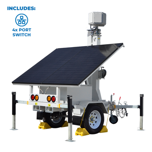 The AL2000-NS4 is Optiview’s premier solar-powered mobile trailer, designed with an integrated 4 Port Network Switch. This feature provides a robust and flexible platform, allowing customers to seamlessly integrate and mount their own equipment, tailored to their specific requirements. Whether it’s for surveillance, remote connectivity, or specialized monitoring, the AL2000-NS4 offers unparalleled adaptability. Its impressive 24′ 1.5″ max deployment height combined with the power of its solar panels and battery bank ensures consistent performance, even in the most demanding environments.