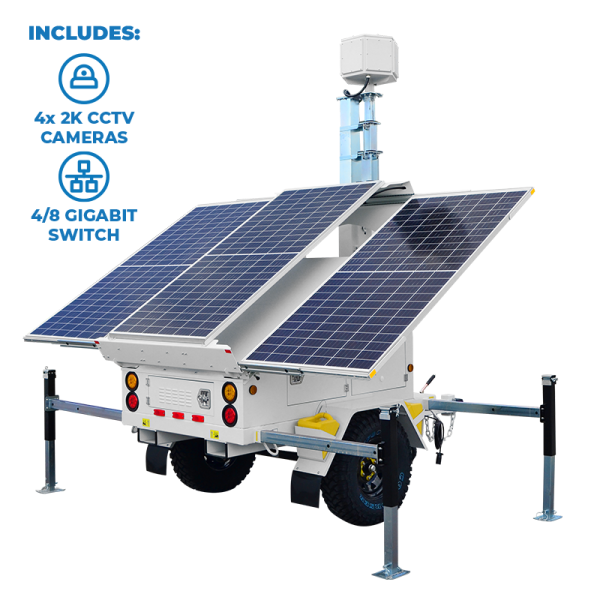 Presenting the AL3000-EDGE4F-2K, the evolution of Optiview’s solar-powered surveillance trailers. Equipped with four 2K fixed cameras featuring edge recording capabilities, this DOT-approved system delivers comprehensive 360-degree surveillance with a wide 101° viewing angle per camera. Enhanced by machine learning-powered Ultra Motion Detection, it excels at human and vehicle detection while significantly reducing false alarms. Real-time power notifications and a robust 1290W solar array backed by a 1200Ah battery bank ensure reliable operation, while each camera includes a built-in microphone and performs exceptionally in low-light conditions with 0.01 LUX sensitivity. The AL3000-EDGE4F-2K combines sophisticated security features with a commanding 23′ 6″ max deployment height for ultimate coverage and reliability.