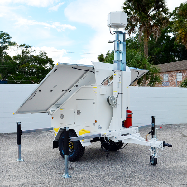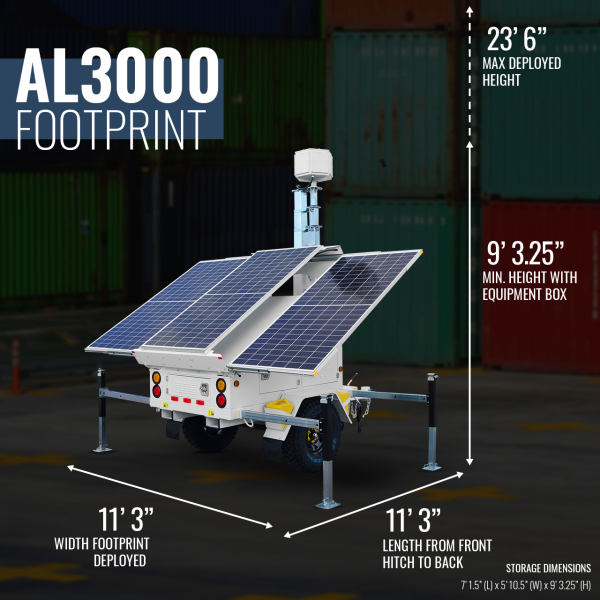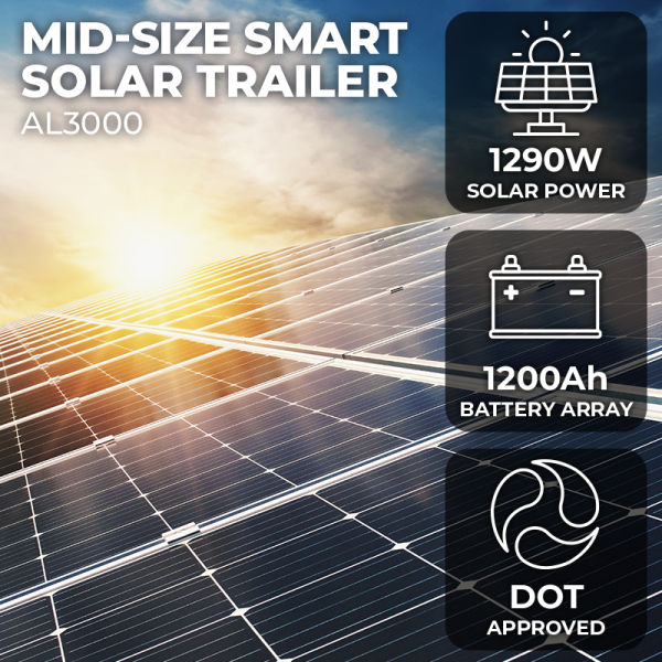 The AL3000 is our brand new Mid-Size Smart Solar Trailer (Department of Transportation Approved) with our smart monitoring and control platform. Equipped with 1290W solar power, 1200AH battery bank deliver our smart monitoring and control platform enables a comprehensive remote real-time power overview with intelligent notifications. With complete customization, get exactly what you need for any job with one of our surveillance, lighting, or remote connectivity packages.
