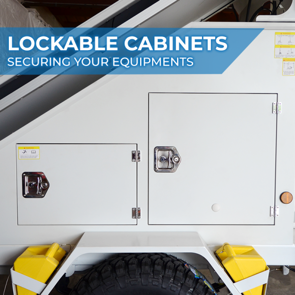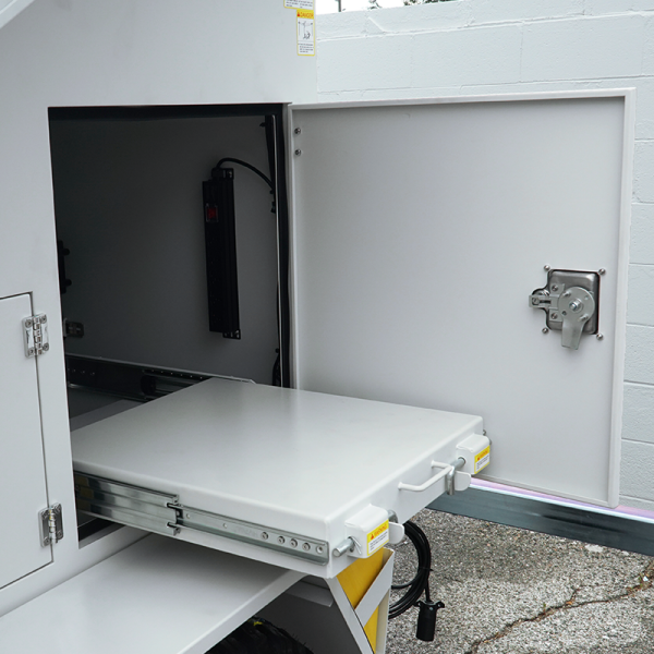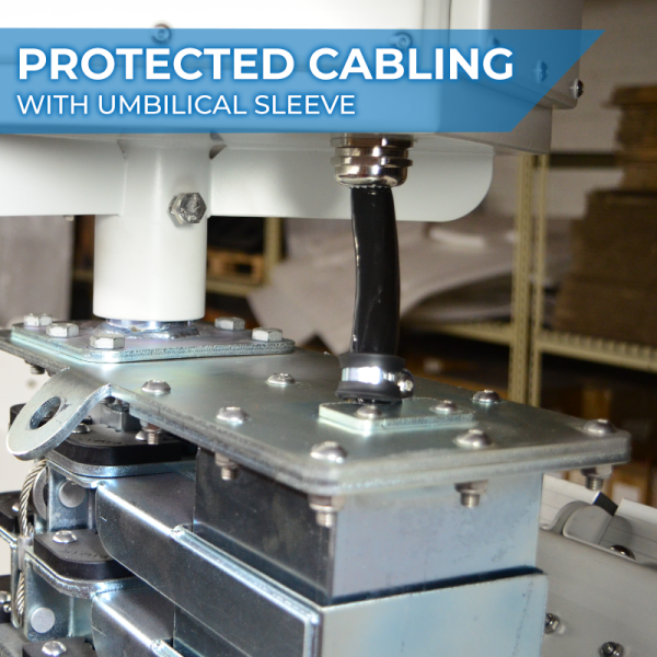 The AL3000’s reaches a max height of 23 ft and 6 in. The mounting plate at the top of the mast can have lighting packages, or a powder coated stainless steel enclosure mounted to it. The enclosure can house any number of equipment, from cellular modems, radar systems, repeaters, switches, or surveillance cameras for site security. Power is provided at the top of the mast via the included umbilical cord.