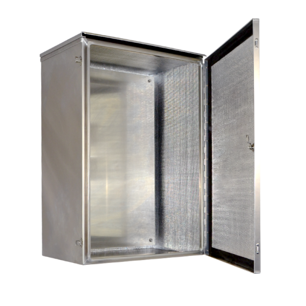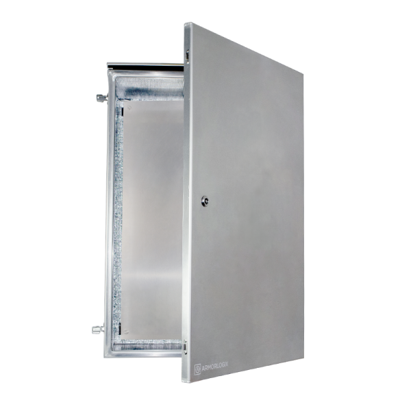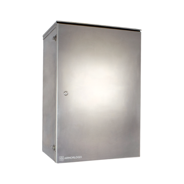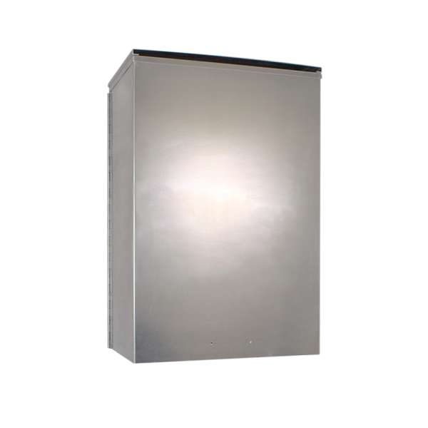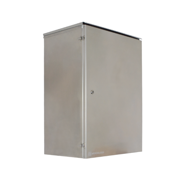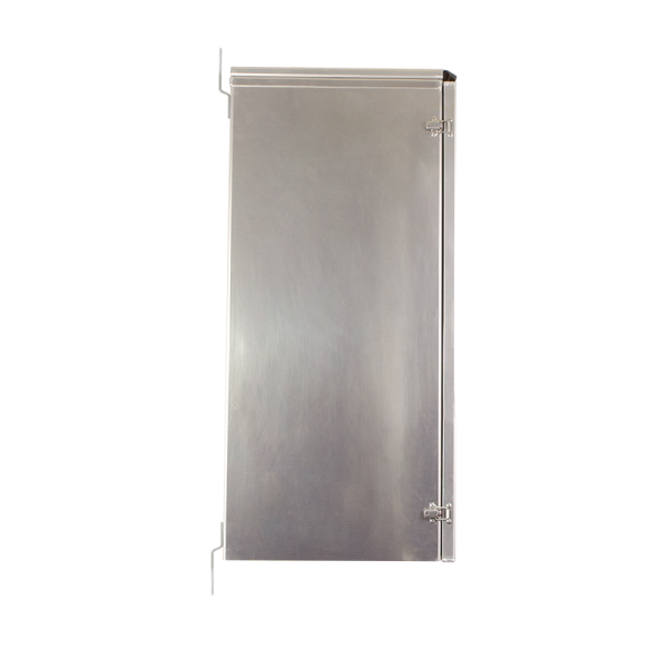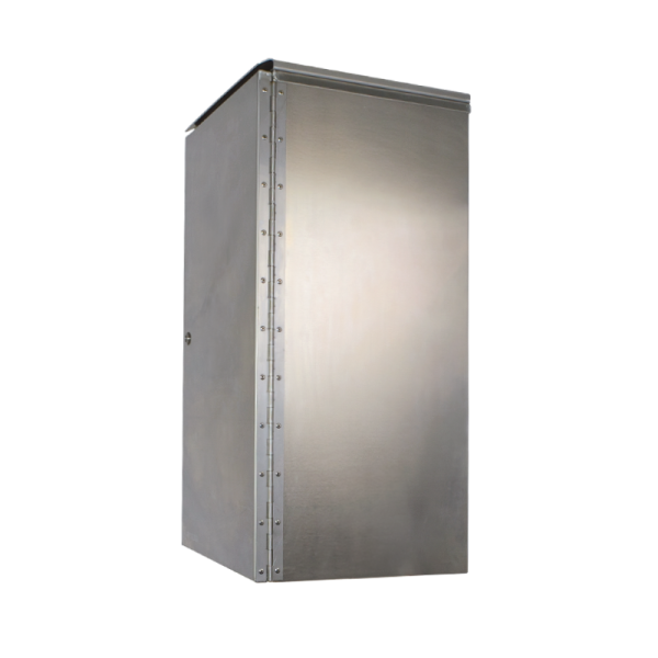The 36″ x 24″ x 16″ NEMA 4 weatherproof enclosure is manufactured from 5052 Aluminum. This construction resists rusting and corrosion making it ideal for use for marine applications as well as other rugged environments. Each enclosure includes a sunshade, insulation, triangular cam lock, and universal mounting brackets. These brackets allow for installers to mount the enclosure directly to a wall (flush mount), or mount to a pole using banding brackets (optional accessory). A removable back-plate allows for items to be installed vertically and assembled outside of the enclosure. Temperature control available with an optional heater.