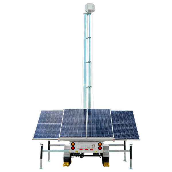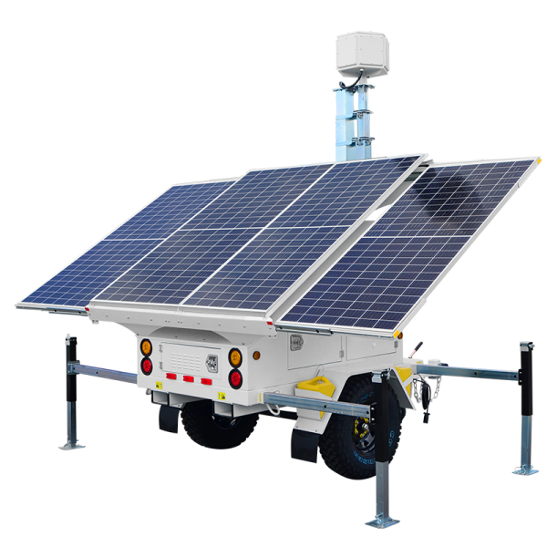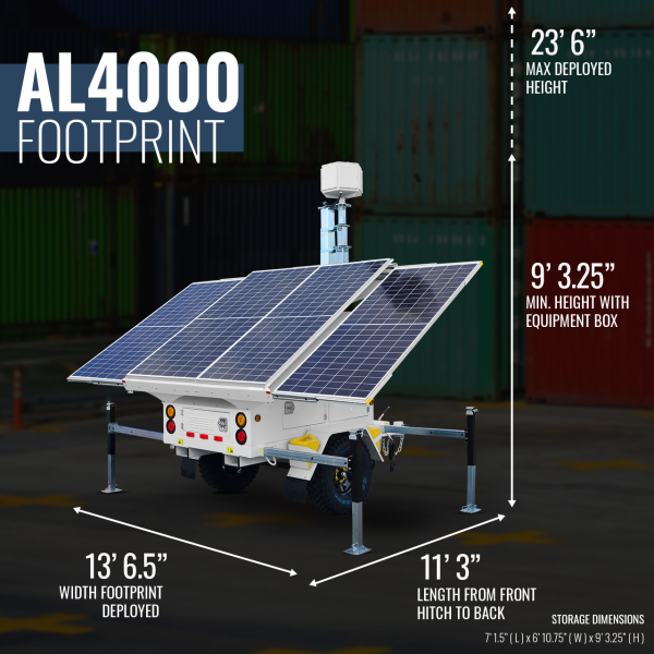 The AL4000 is our most powerful smart solar-powered mobile trailer, featuring an industry-leading 1720W solar array supported by a massive 1600Ah battery bank with real-time power notifications. This Department of Transportation approved trailer maintains easy deployment while reaching a commanding 23′ 6″ max height. Perfect for remote locations with high power demands, this robust platform offers complete customization through our surveillance, lighting, or remote connectivity packages.