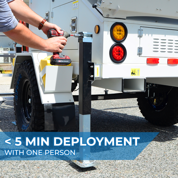 A sturdy hitch takes this solar trailer anywhere your vehicle can go. The solar trailer’s driving height is just over 10’. With trailer pulling experience, this can be deployed by two people in less than 5 minutes, allowing you to get your powered trailer up and running rapidly and easily.