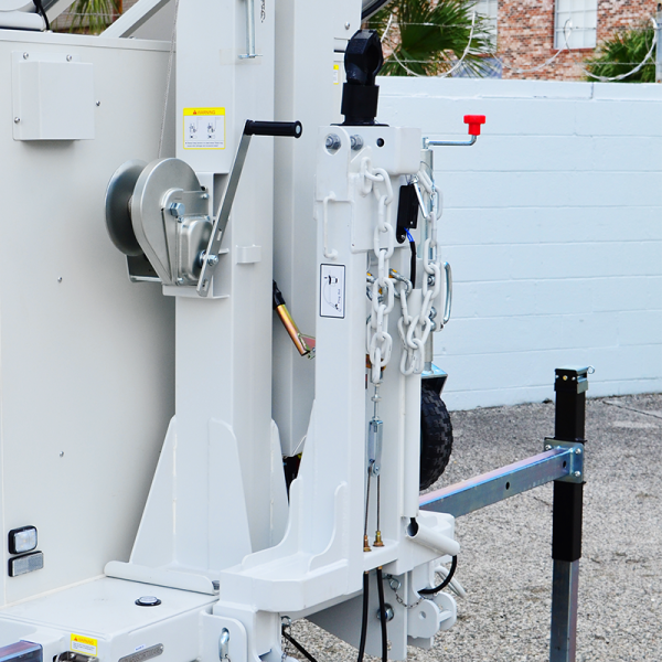 The AL4000’s reaches a max height of 23 ft and 6 in. The mounting plate at the top of the mast can have lighting packages, or a powder coated stainless steel enclosure mounted to it. The enclosure can house any number of equipment, from cellular modems, radar systems, repeaters, switches, or surveillance cameras for site security. Power is provided at the top of the mast via the included umbilical cord.