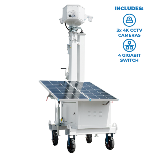 Experience crystal clarity with the AL600-EDGE3F-4K, our advanced solar-powered mobile surveillance cart designed for comprehensive coverage. Equipped with three 4K (8MP) NDAA Cameras featuring edge recording, this model captures high-definition footage directly to embedded Memory Cards, ensuring continuous surveillance without the need for external infrastructure. With over 336° view, you can point each camera exactly to the area you need, making it an ideal choice for diverse surveillance needs. Enhanced with Smart Intrusion Prevention, Ultra Motion Detection, and sophisticated people counting capabilities, each camera includes a built-in microphone and performs exceptionally in low-light conditions with 0.01 LUX sensitivity. With its impressive max height and easy setup, this cart provides a bird’s-eye view, ensuring no detail goes unnoticed.