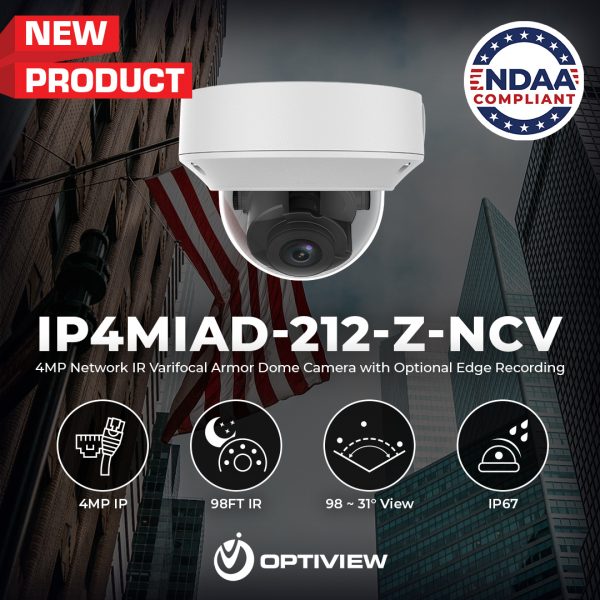 The IP4MIAD-212-Z-NCV is one of Optiview’s NDAA compliant IP security cameras, and can be paired with any of Optiview’s NCV line of NDAA compliant network video recorders.