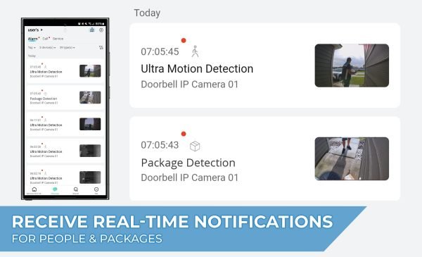 Receive real-time notifications for people and packages detected at your location. Notifications allow you to engage with visitors with One Tap Call and Answering. Alerts provide direct access to event playback, minimizing time spent reviewing footage and enabling faster incident verification.