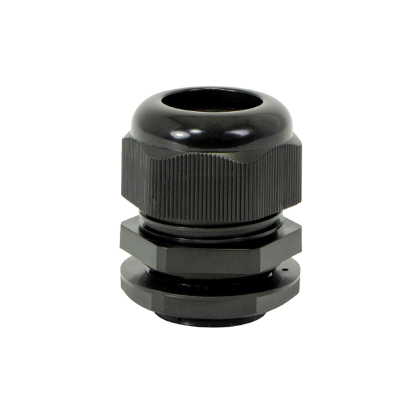 Black 1″ diameter weatherproof cable gland for ArmorLogix enclosures. Nylon adjustable locknut / cable gland.