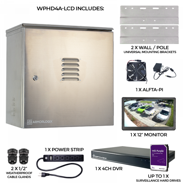 This 4 camera HD weatherproof 4K DVR package includes everything you need for remote site recording. It includes: