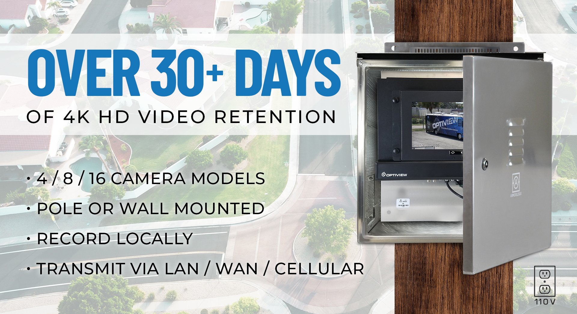 Add or expand your surveillance system with an outdoor weatherproof DVR or NVR. Available for HD-over-Coax or IP cameras, Optiview’s weatherproof recorders can be pole or wall mounted, have an automatic thermostat/fan for temperature control, and can be accessed anytime via LAN, WAN, or Cellular. Add to the Optiview VMS or Mobile App for remote monitoring.